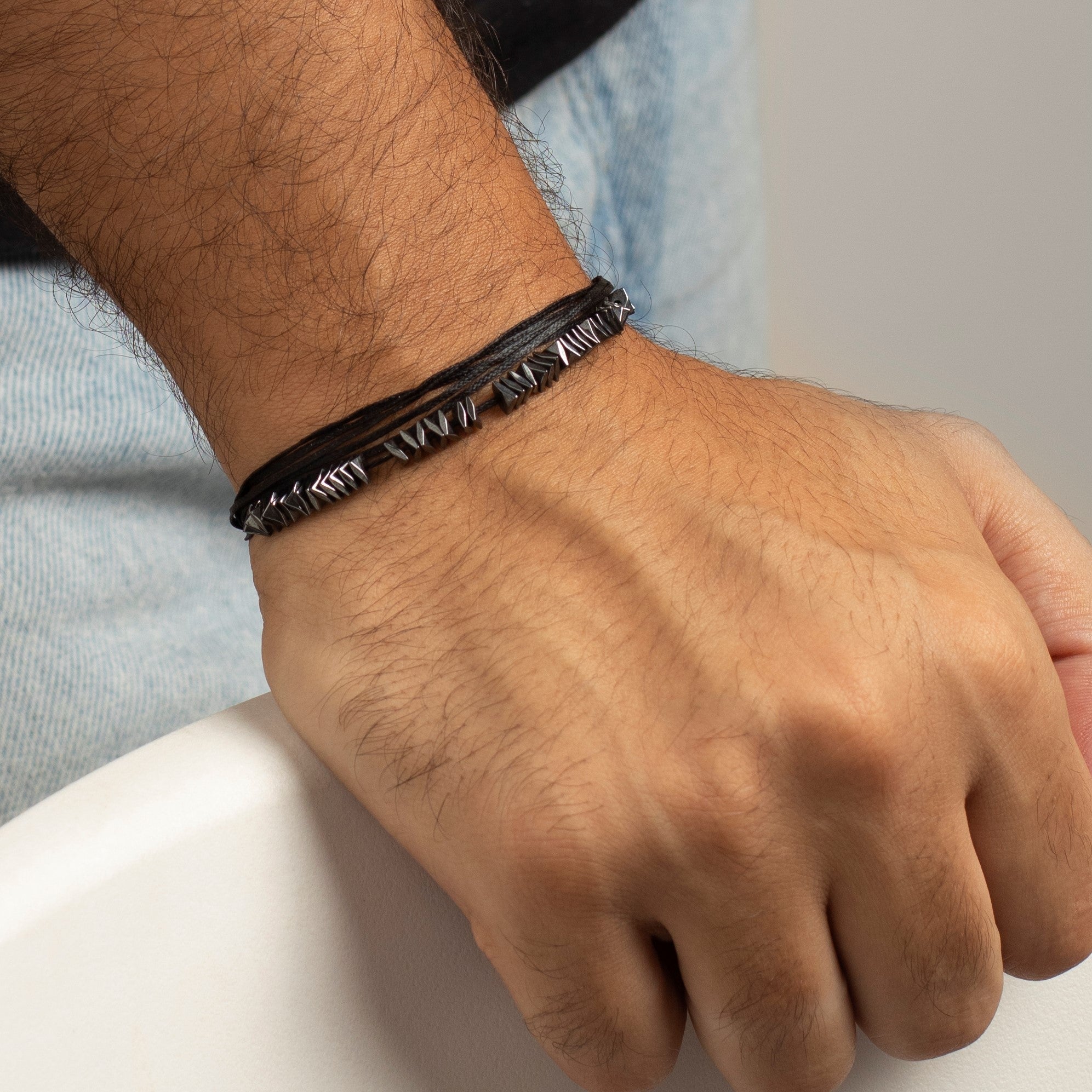 This elegant bracelet features a striking row of black or dark grey Hematite beads. The beads are meticulously set on a silk thread, which is secured by a polished sterling silver lock.