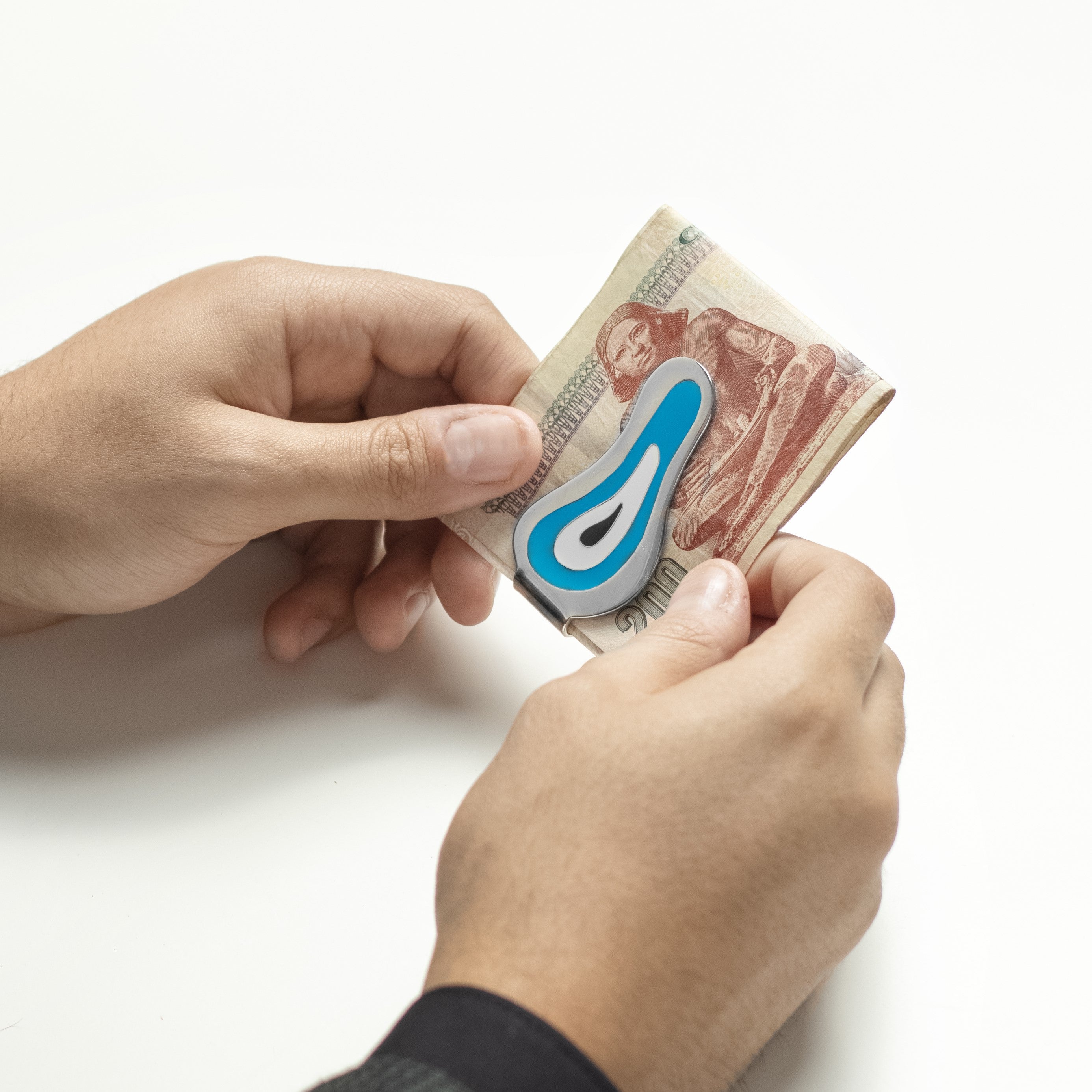 A fluid and modern money clip, in platinum plating. The piece has a dynamic, tear-shaped form with layers of cobalt, light blue, and black enamel, offering a distinctive and artful accessory.