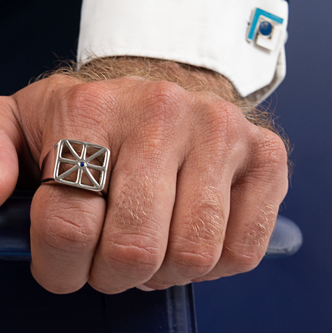 This platinum-plated sterling silver signet-style piece features a central negative space with a single blue accent. The design's geometric lines give it a modern, architectural feel while the design is reinterpretation of the eye.