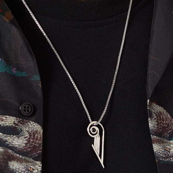 This necklace is a statement of modern elegance, embodying the sleek lines and geometric forms of Art Deco. The piece features a stylized pendant crafted from polished sterling silver, with an intricate curved design and a single, vibrant blue stone at its center.