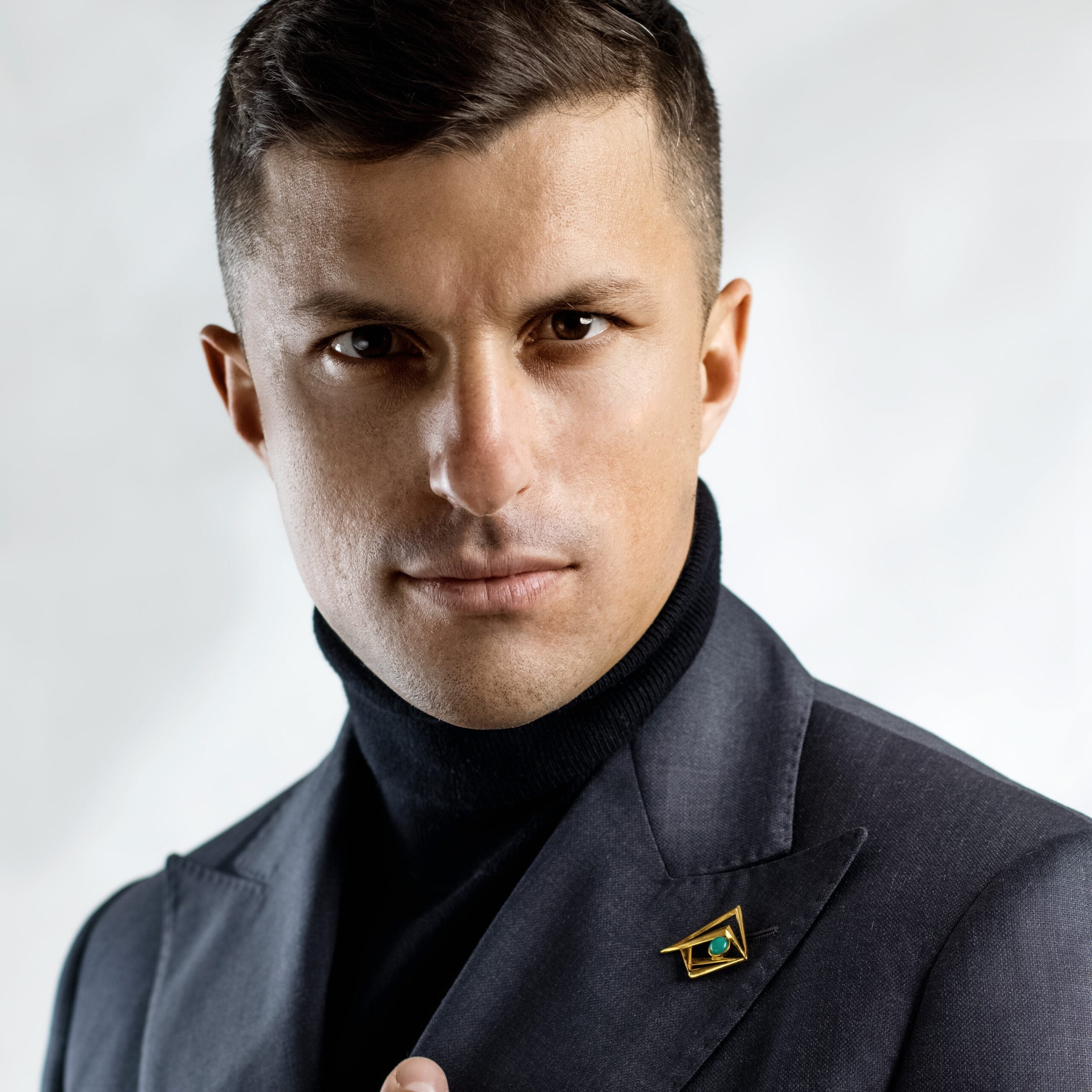 This lapel pin is a modern interpretation of Art Deco's clean lines and bold aesthetics. The piece features a stylized geometric eye crafted from 18k gold-plated sterling silver with a vibrant green stone at its center.