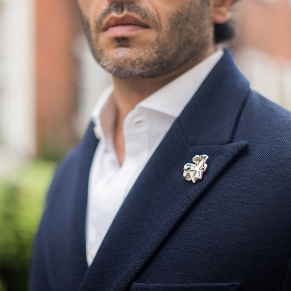 This unique lapel pin is a celebration of individuality and refined taste, fitting for the modern groom. Crafted from polished platinum-plated sterling silver, its design features a single, stylized flower with gracefully folded petals, offering a sculptural and edgy take on a classic bloom.