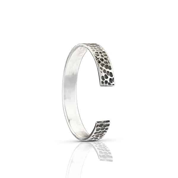 This cuff bracelet blends a classic royal form with a rich, distressed finish. The piece is crafted from sterling silver with a rustic platinum finish and features a captivating, hammered texture that gives it a unique feel.