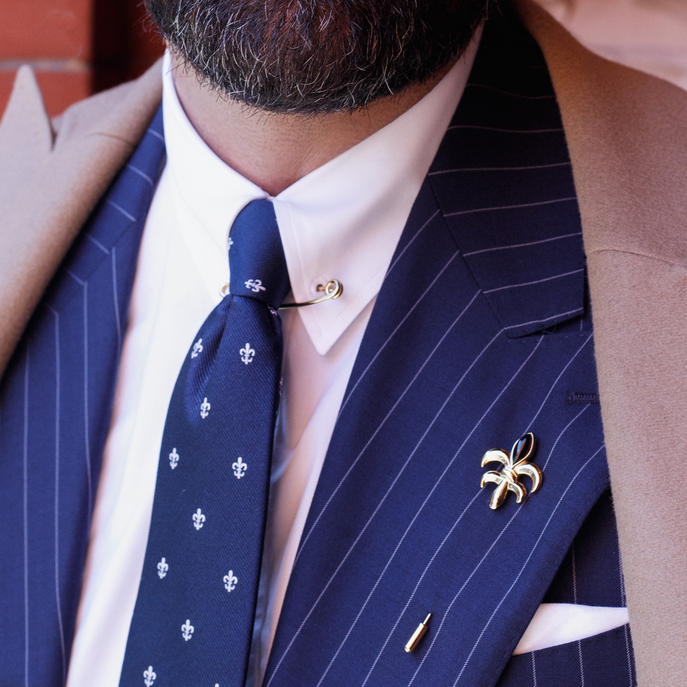 This unique lapel pin offers a modern take on a classic symbol of royalty and power. The piece features a gold-plated sterling silver Fleur De Lis, elegantly detailed with a polished black onyx stone at its center.