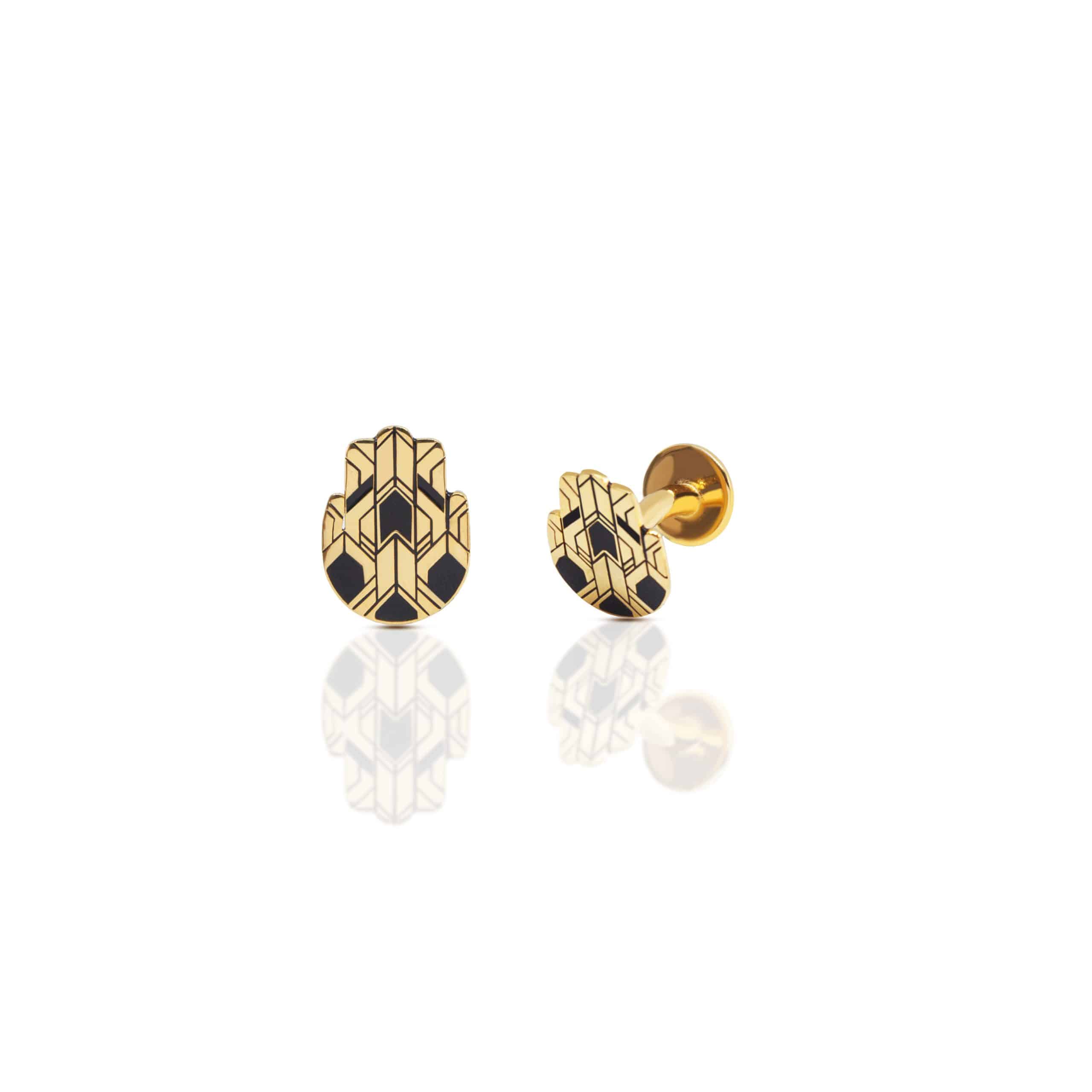 The cufflinks are a modern interpretation of a classic symbol, blending cultural heritage with Art Deco's bold and elegant aesthetics. The piece features a stylized geometric Hamsa hand crafted from 18k gold or platinum-plated sterling silver with intricate black detailing.