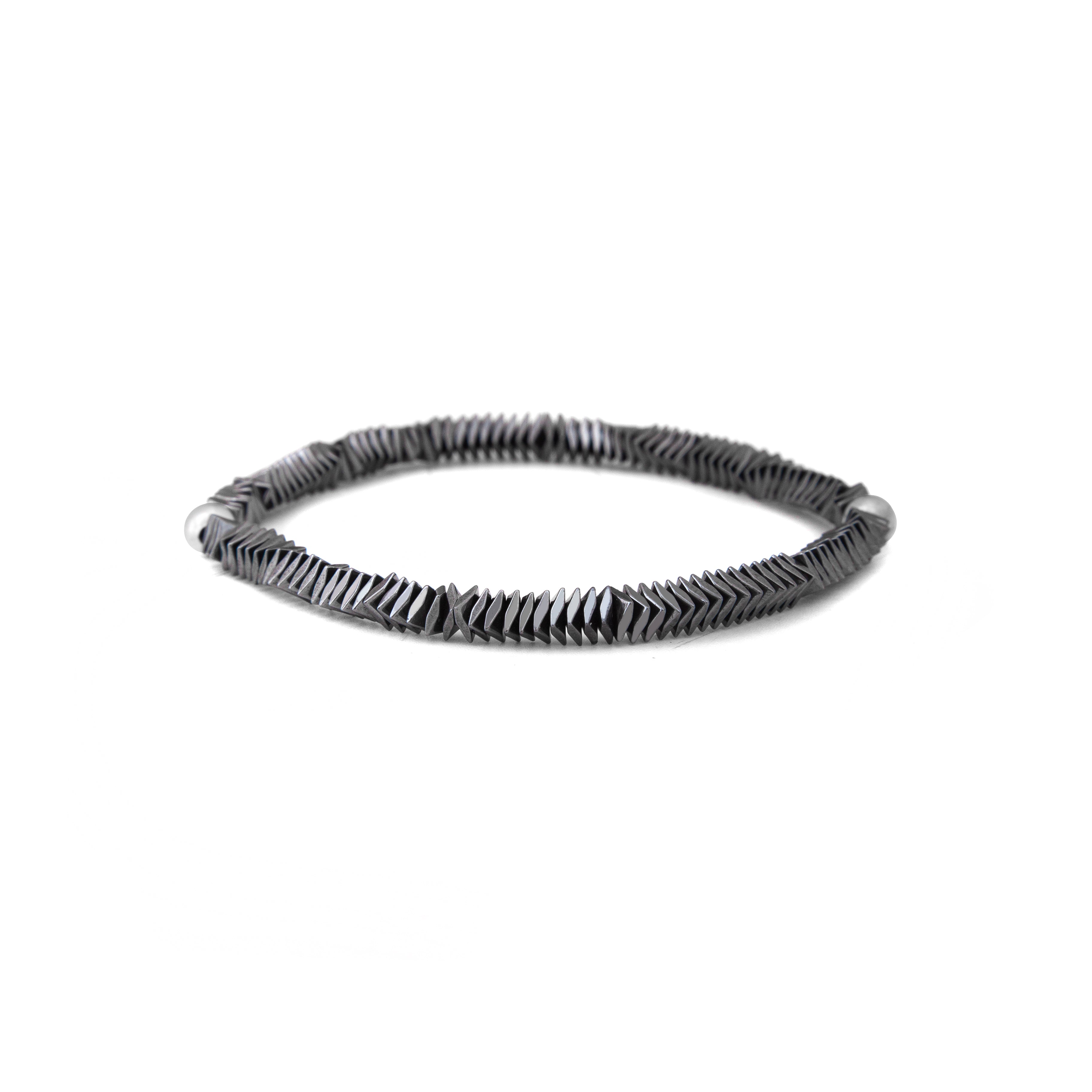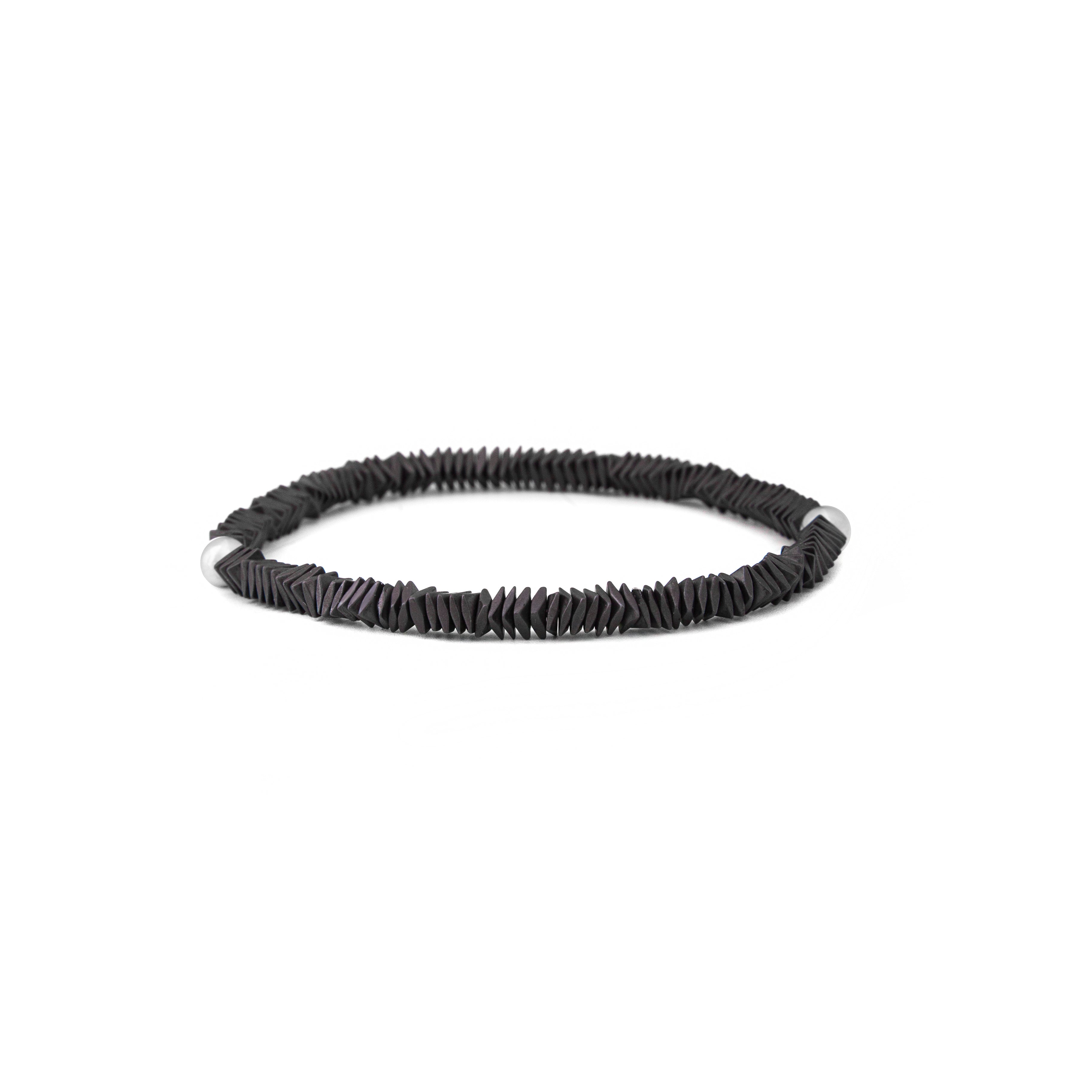 This minimalist bracelet features a continuous strand of multifaceted, dark hematite beads. The geometric beads are arranged to create a sleek and modern texture.