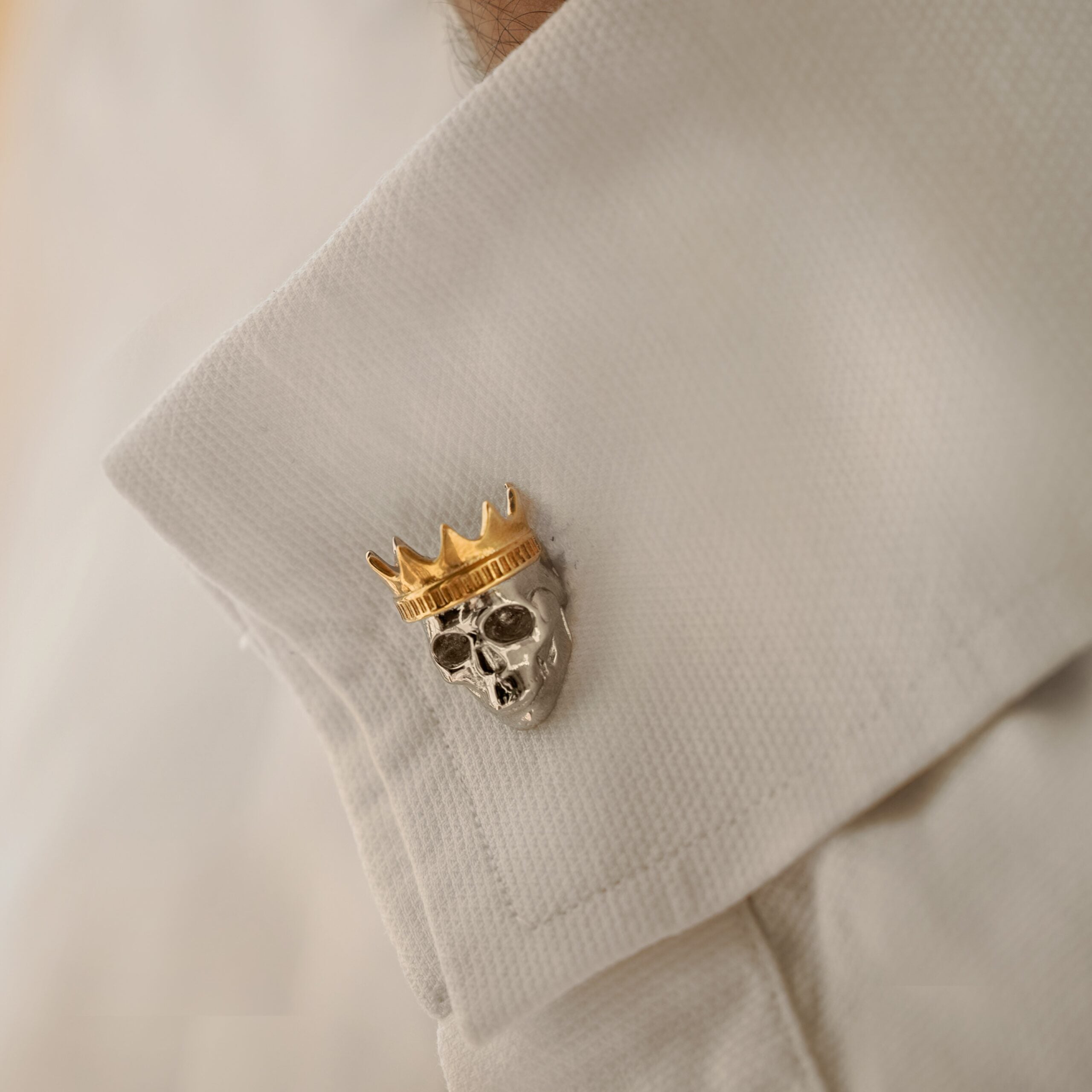 This unique pair of cufflinks features a meticulously crafted sterling silver skull topped with a polished gold-plated crown, creating a two-toned accessory that offers a distinguished and unconventional touch to any look.