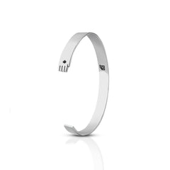 This versatile bracelet is crafted from polished platinum-plated sterling silver, the open-cuff features a distinct end with a series of parallel grooves and a single black stone, offering a unique contrast to its smooth, rounded finish.