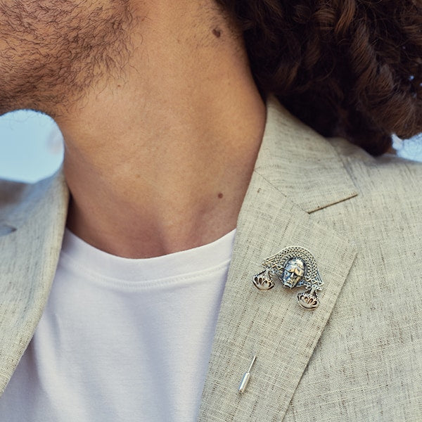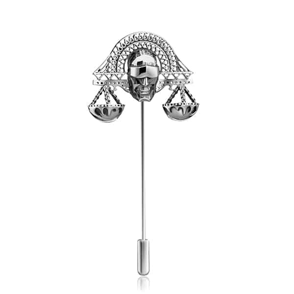 This lapel pin is a powerful symbol of balance and justice, capturing the spirit of the Libra zodiac sign. The piece features a meticulously crafted antique platinum-plated sterling silver design with a set of scales and a central skull.