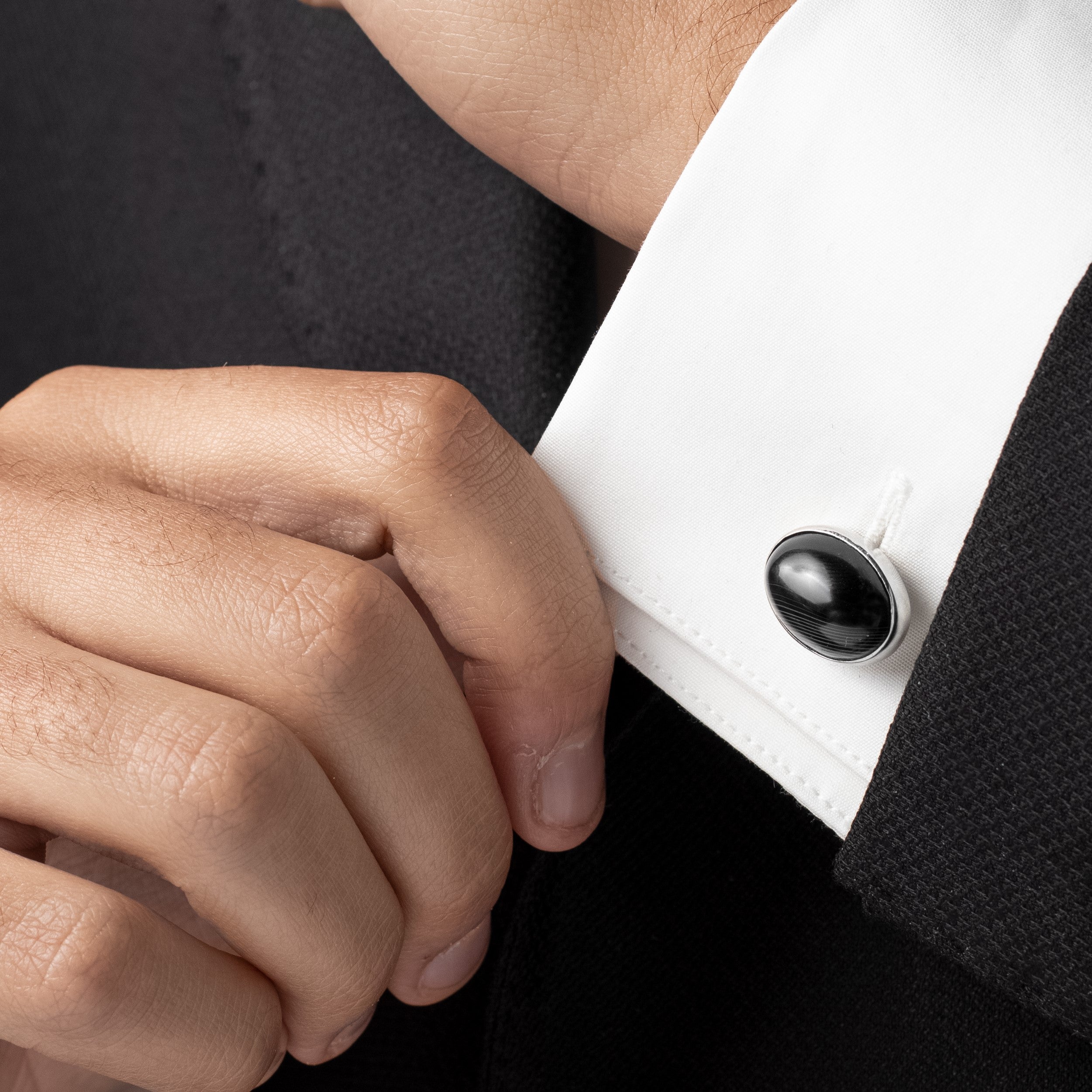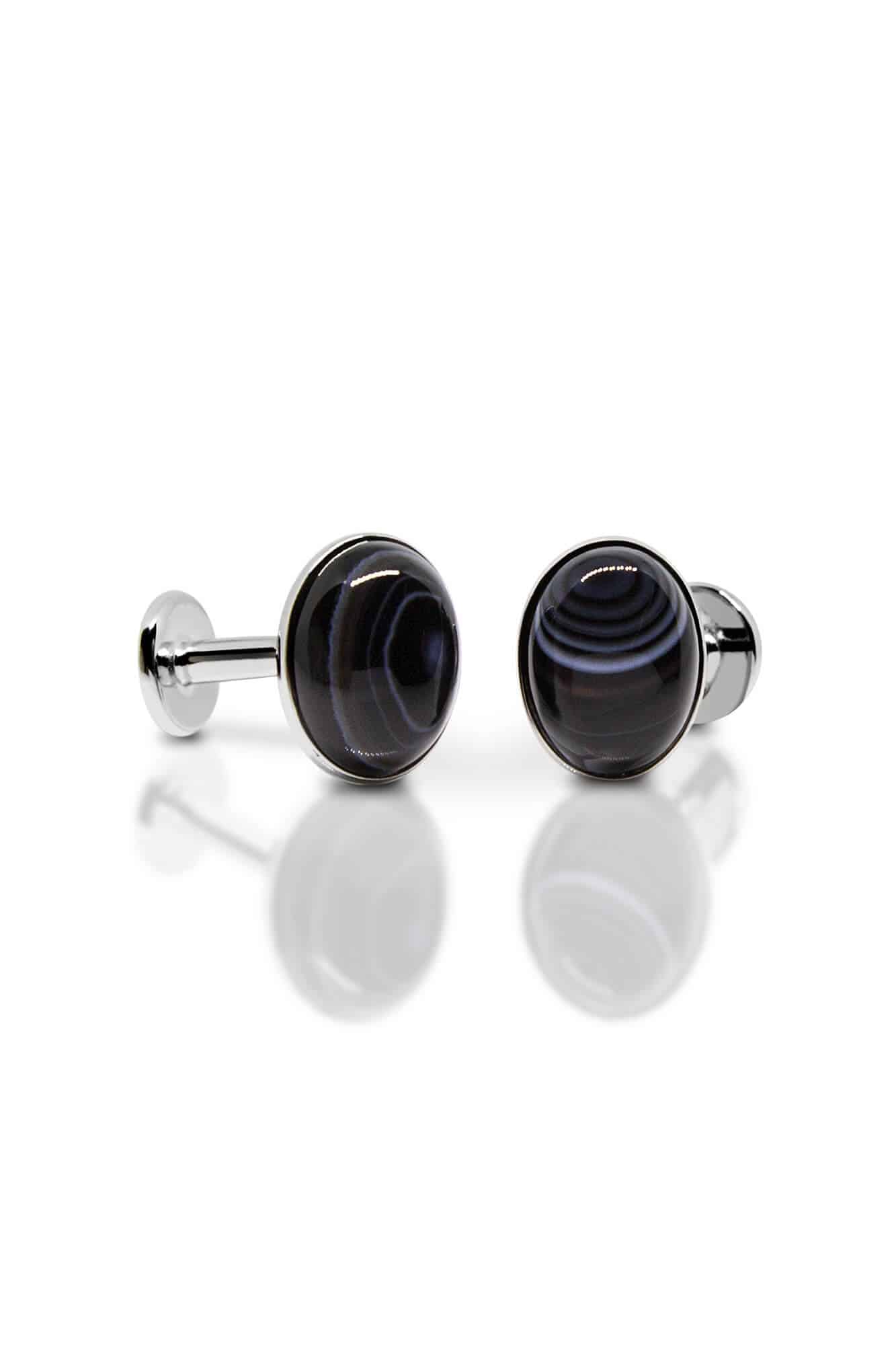 This classic pair of cufflinks showcases the pure and striking beauty of the natural world. Each piece features a black agate stone with a captivating banded pattern, set in a polished sterling silver base.