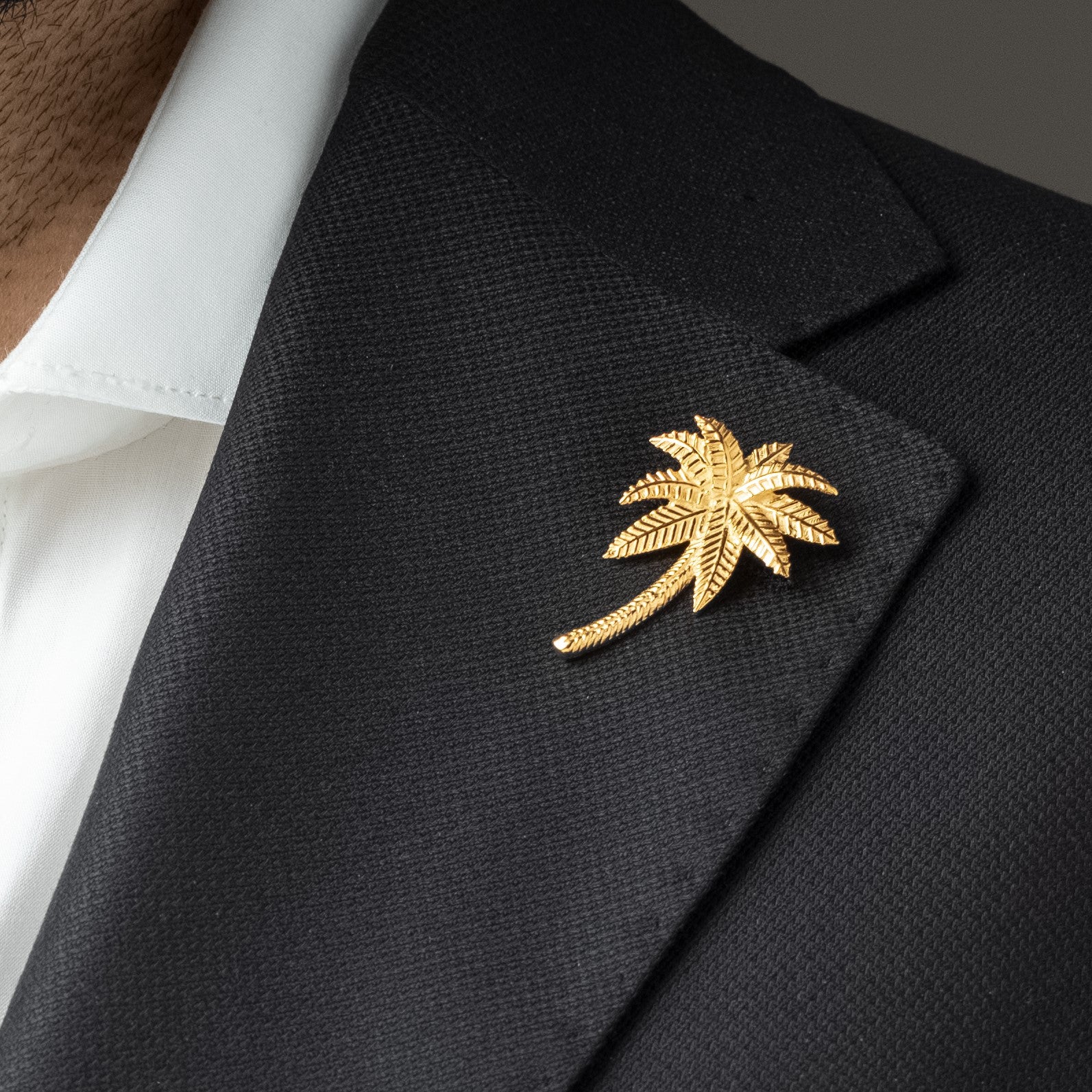 This lapel pin is crafted from sterling silver with a gold-plated finish, the piece features a meticulously detailed and textured palm tree, offering a distinguished accessory that adds a touch of pure and lasting style.