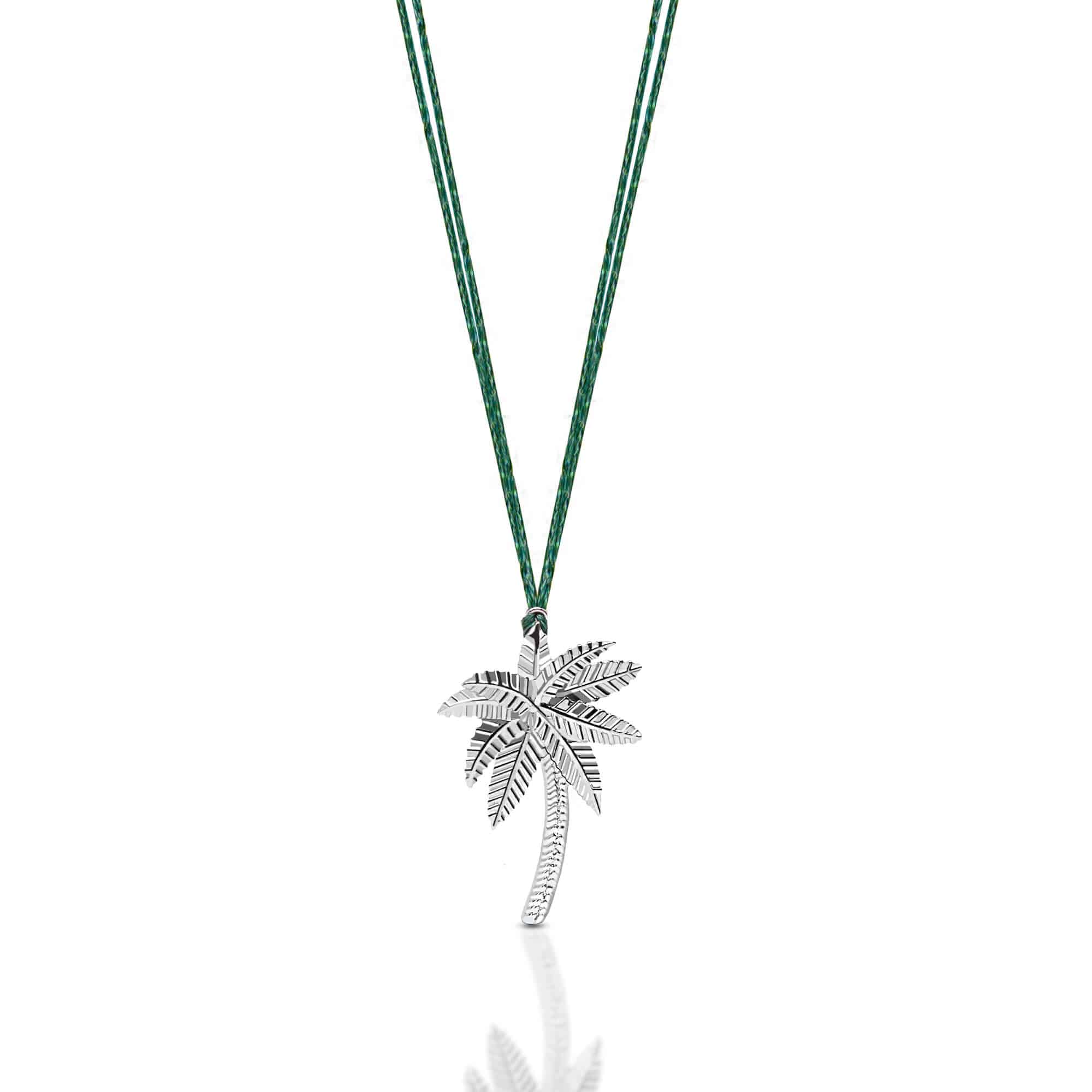 This necklace is crafted from sterling silver with an option of a platinum or gold-plated finish, the piece features a small, detailed palm tree pendant on a multi-strand thread.