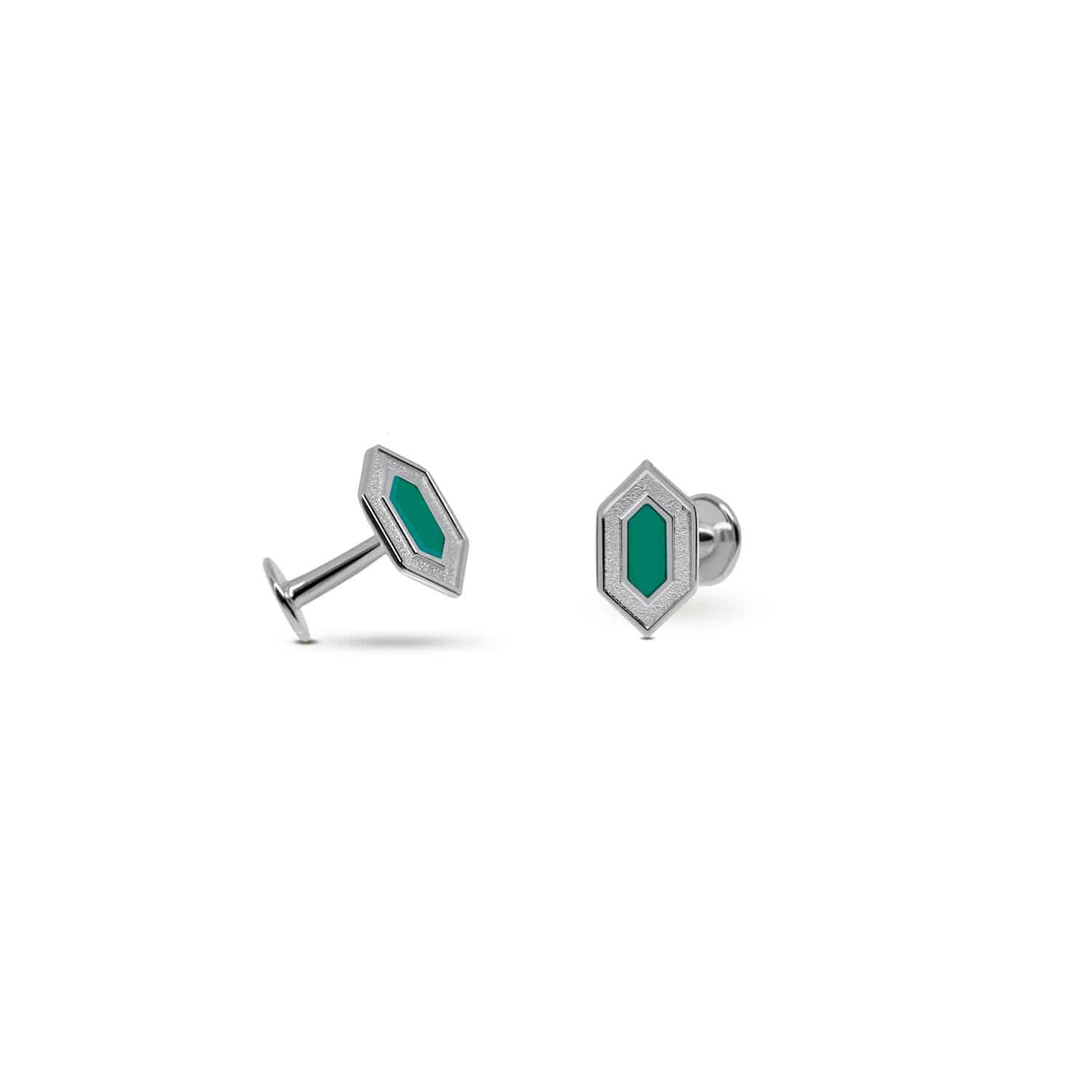 This striking pair of cufflinks is a statement in bold, geometric elegance, embodying the modern spirit of Art Deco. Each piece features a stylized hexagonal design crafted from 18k gold or platinum-plated sterling silver, with a textured outer frame and a sleek black or green stone at its center.