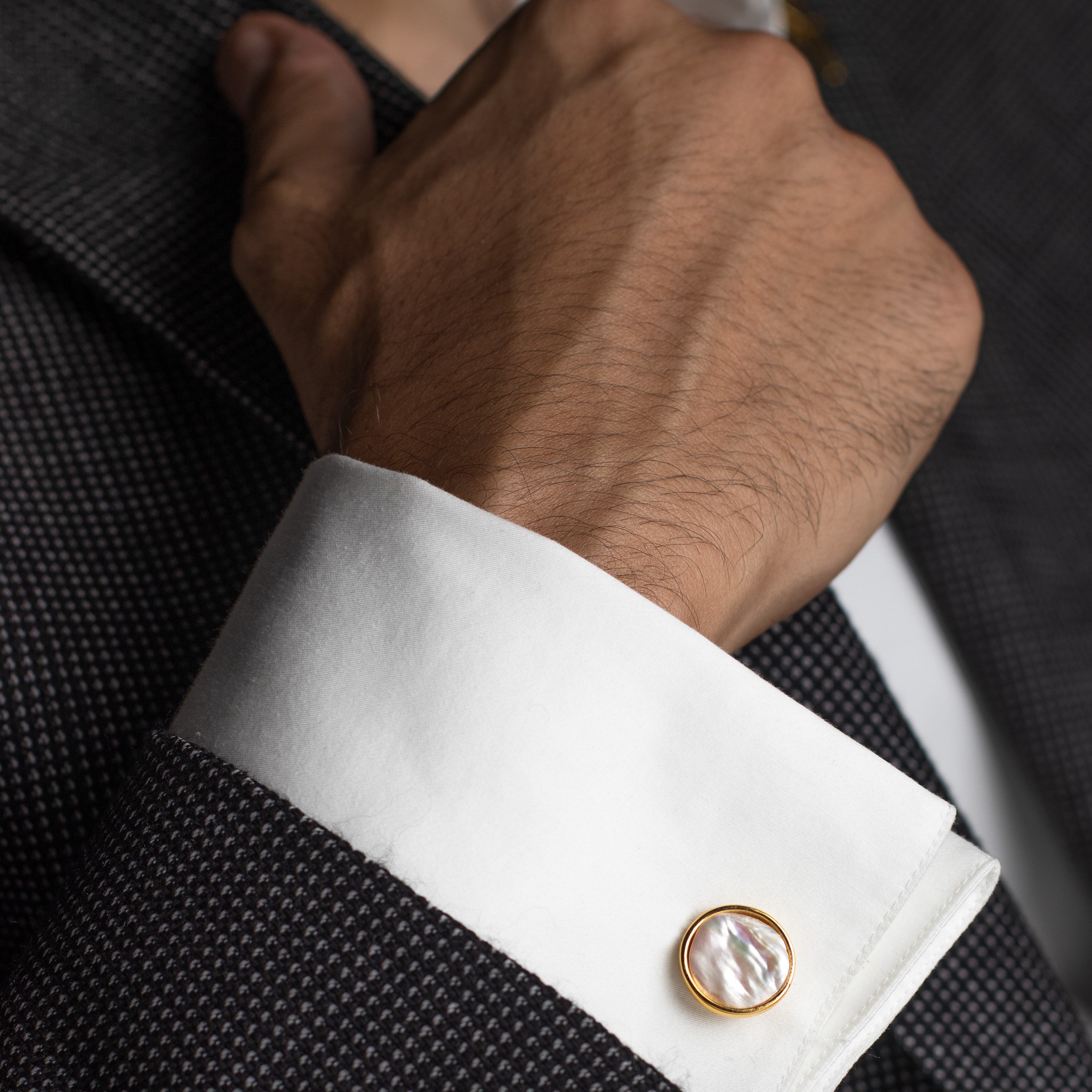 This classic pair of cufflinks is a testament to natural beauty and a refined, timeless aesthetic. Each cufflink features a smooth, iridescent natural pearl inlay set within a polished oval base. Crafted from sterling silver with a gold-plated finish, this accessory adds a touch of pure and lasting style.