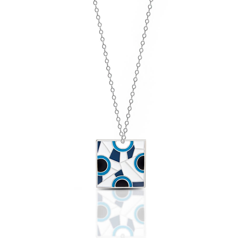 This gold or platinum plated sterling silver necklace is a contemporary take on a timeless motif. It features a square pendant with a mosaic of abstract Evil Eye designs in a striking combination of blue, white, and black enamel.