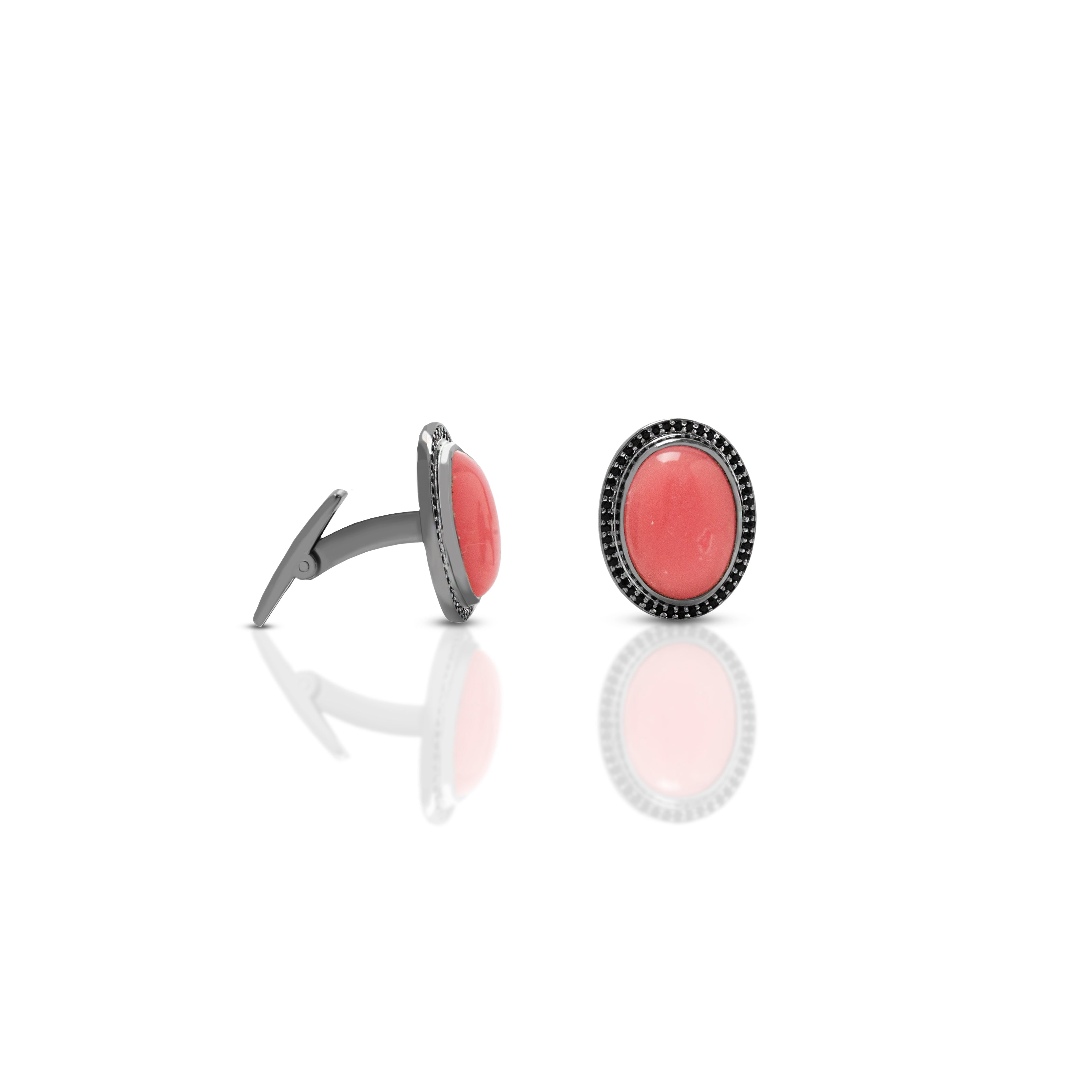 These elegant cufflinks feature a striking combination of color and texture. Each piece showcases a polished pink stone at its center, surrounded by a delicate rim of small black stones set in a sterling silver frame.