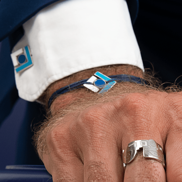 A bold, geometric design defines this platinum-plated bracelet. It features a central deep blue design, bordered by sharp lines of white and light blue enamel, forming a powerful, modern emblem of protection.