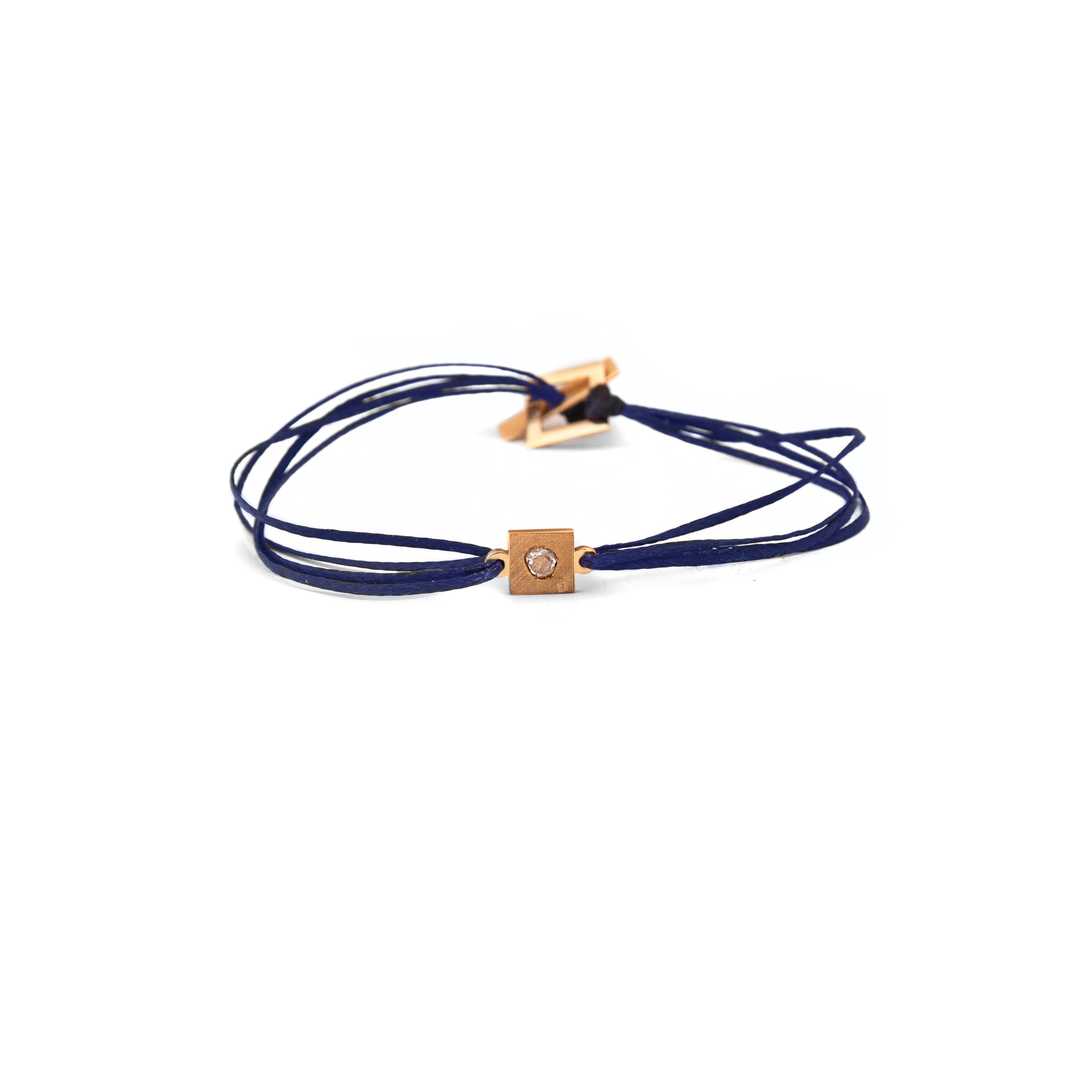 Minimalist bracelet with a rough square 18K gold setting and diamond detail, paired with a sleek cord for modern elegance.