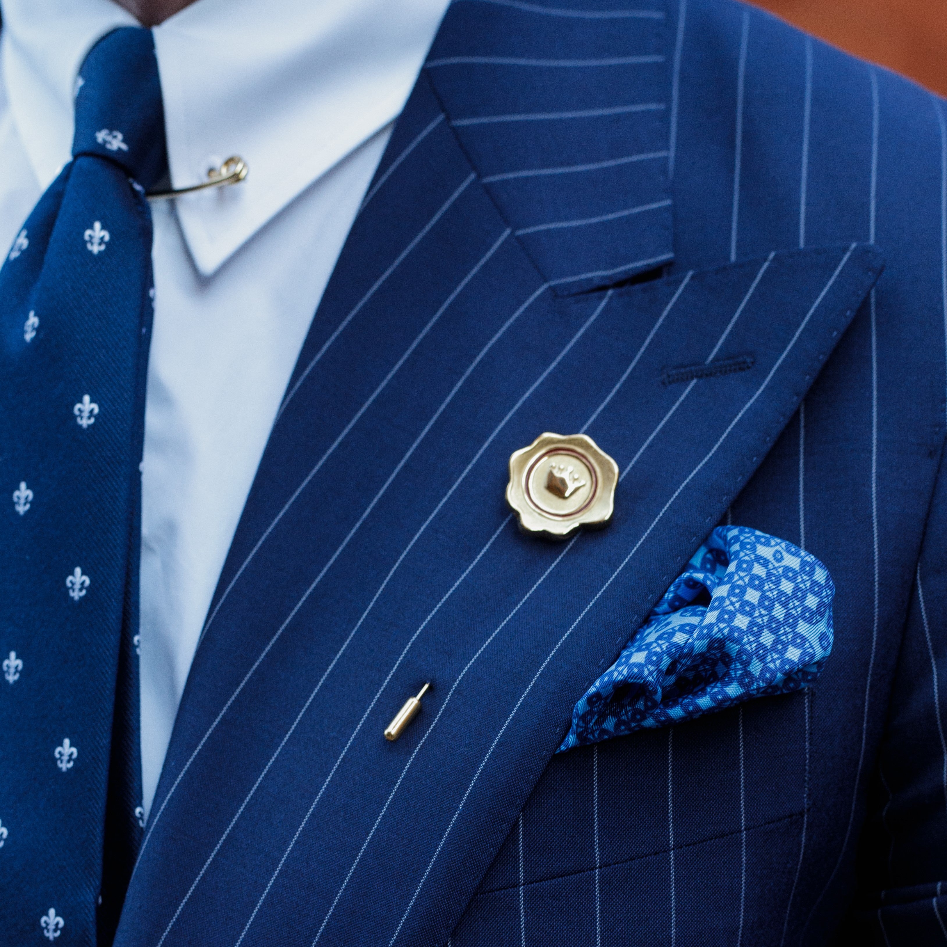 This lapel pin features a gold-plated sterling silver design with an organic, wax-like finish and a royal crown emblem at its center with a surrounding red-enamel circle design.