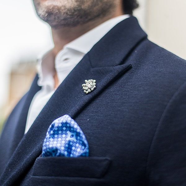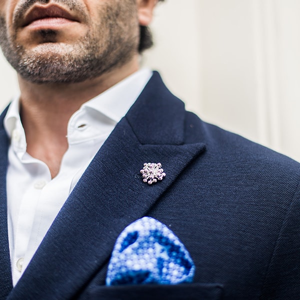 Inspired by the delicate and clustered bloom of the flower, this lapel pin is a unique accessory for the modern groom. Crafted from polished platinum-plated sterling silver, its design features a captivating cluster of individual spheres, creating a textured yet harmonious piece of jewelry.
