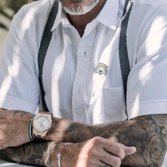 This unique lapel pin is a powerful statement piece, offering a sense of distinction and an artistic design. The piece features a stylized peacock tail, meticulously crafted from a fan of polished sterling silver spheres and accented with two vibrant stones at its center.