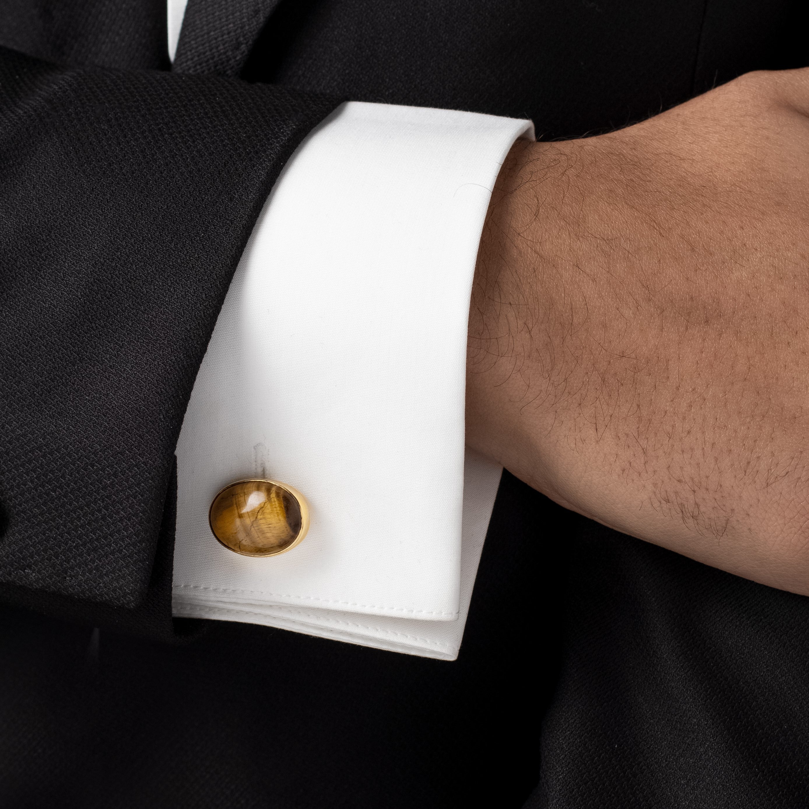 This unique pair of cufflinks is a powerful statement piece, drawing its inspiration from the natural world. Each cufflink features a polished, domed tiger eye stone set in a sleek, gold-plated metal base, creating a rich and sophisticated accessory that showcases a captivating play of light.