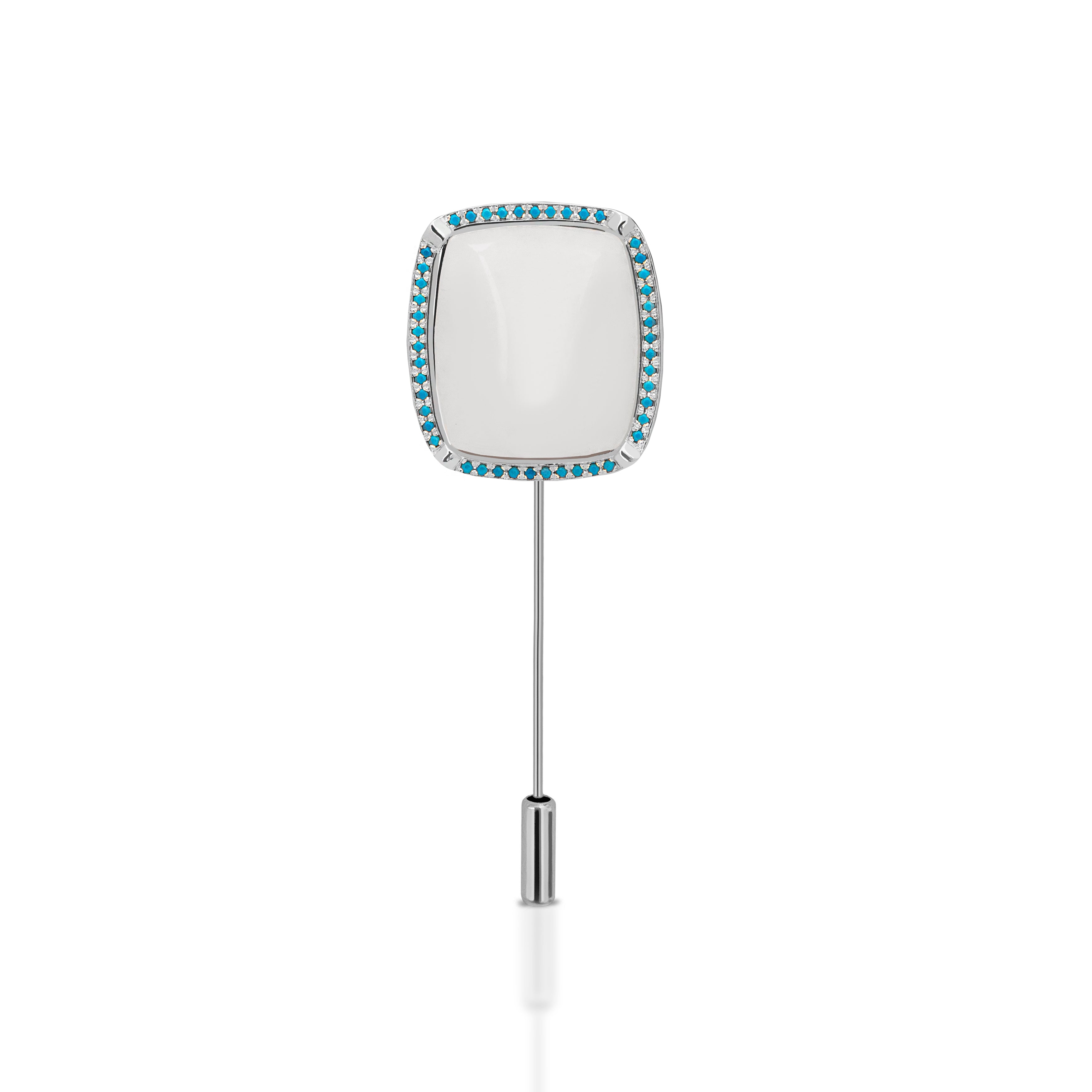 This striking sterling silver lapel pin is inspired by the clean contrast of nature's colors. It features a smooth white stone, bordered by a vibrant halo of turquoise stones.